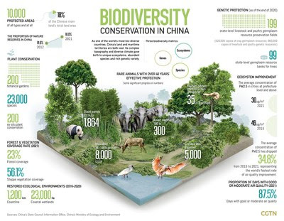 Согласно официальному документу по сохранению биоразнообразия, с 2015 года Китай разработал 10 экспериментальных программ по созданию системы национальных парков на площади 2,2 млн гектаров. На этой территории охраняются различные виды, находящиеся под угрозой исчезновения, такие как гигантские панды и тибетские антилопы. Кроме того, в Китае создано почти 10 000 природных заповедников, на которые приходится около 18% всей территории страны.