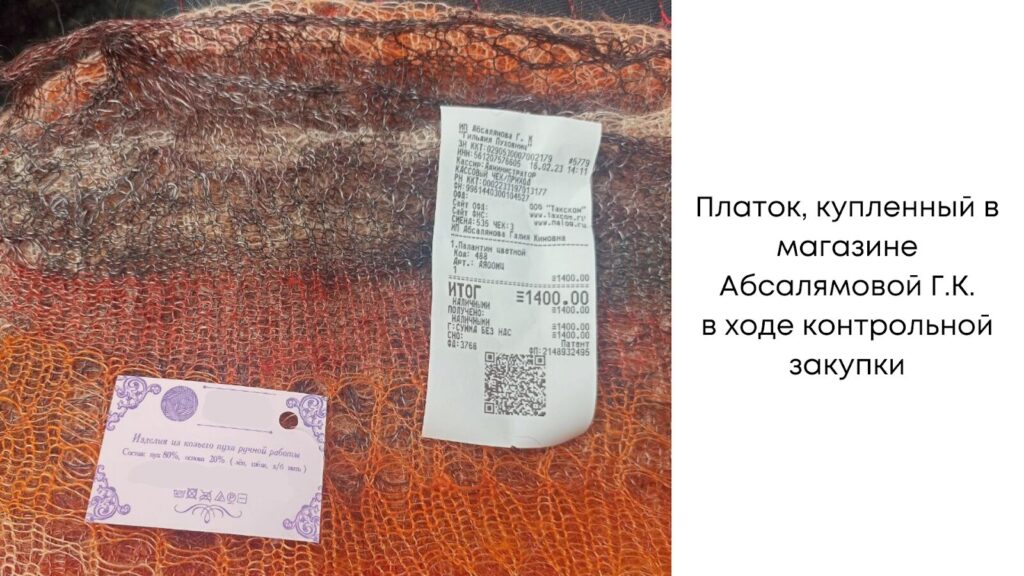 При этом судами установлено, что Абсалямова Г.К. активно торговала контрафактом – суд взыскал с нарушителя компенсацию 1,8 млн руб., что говорит о крупном обороте подделок, который носил систематический характер в течение длительного срока. Важно отметить, что данные нарушения были установлены судом после того, как Абсалямова Г.К. получила статус НМПТ. В судах было доказано, что зарегистрировав несколько оригинальных образцов, Абсалямова Г.К. под прикрытием НМПТ «Оренбургский пуховый платок» торговала подделками.