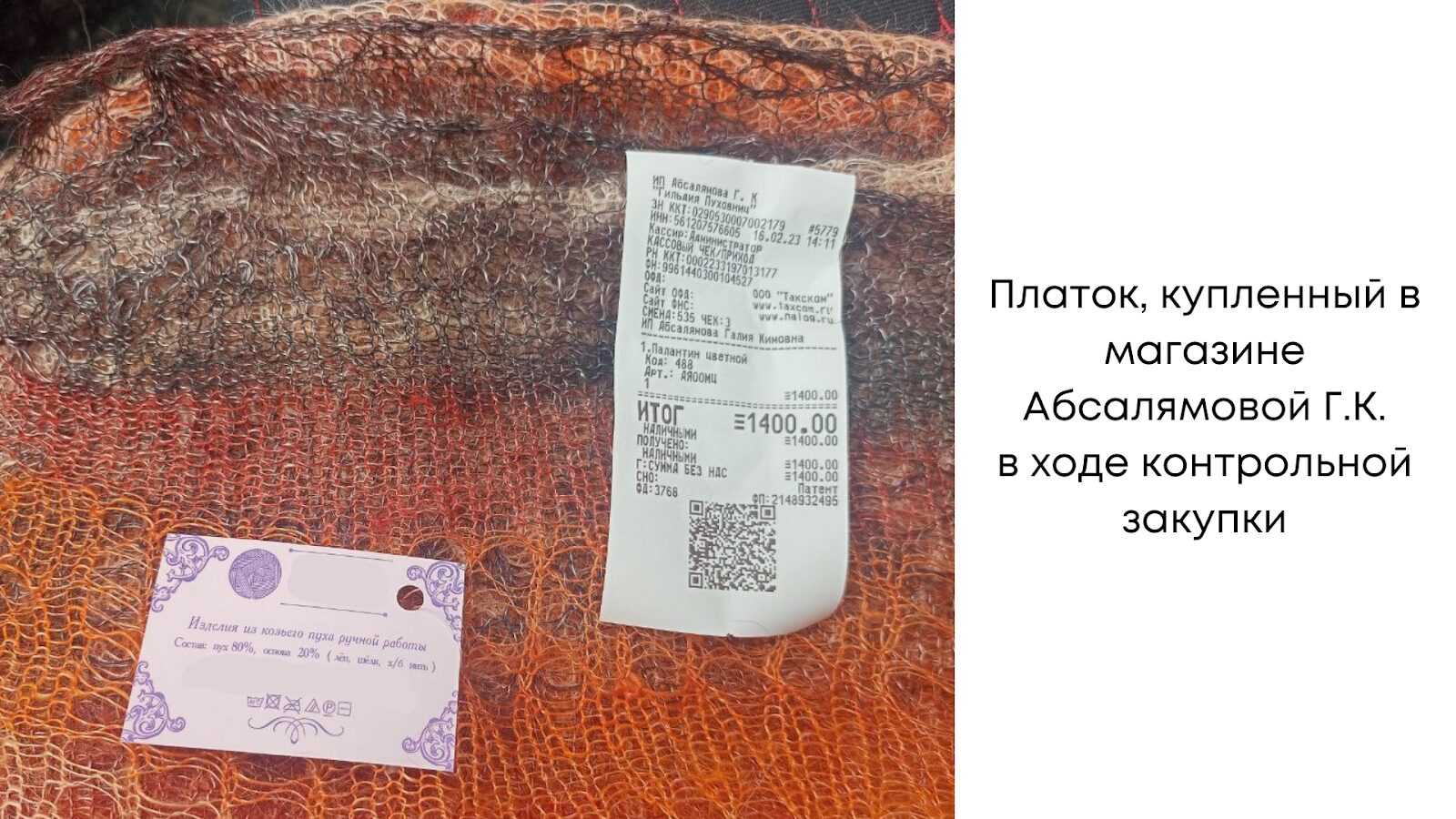 Также по коллективному иску более 20 пострадавших граждан было доказано, что в изделиях Абсалямовой Г.К. вместо пуха содержится шерсть, а вместо шёлка – дешёвая синтетика; на этикетках указывались недостоверные составы (например, заявленные 80% пуха при фактических 40% шерсти, или 20% шёлка при фактических 50–60% синтетики).
