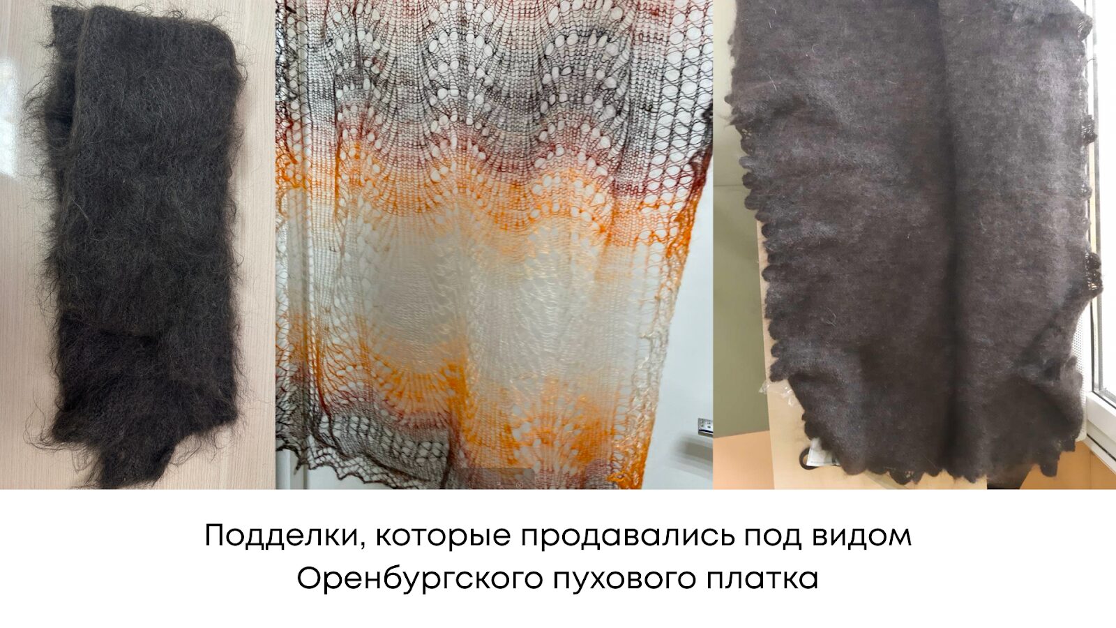 Основной поток подделок – из Дагестана и Карачаево-Черкесии. Недобросовестные продавцы закупают массовые изделия («узбечка») за 300 руб., позиционируют как «оренбургские» и продают за 3 000 руб. Подделки, купленные за такую низкую цену, не сопоставимы с подлинными Оренбургскими платками: вместо тончайшего пуха – некачественная шерсть и синтетика, нарушены каноны вязания и орнамента, отсутствует контроль качества. Для правообладателей это системная боль: контрафакт подрывает доверие к промыслу, искажает рынок и наносит репутационный ущерб всей отрасли.