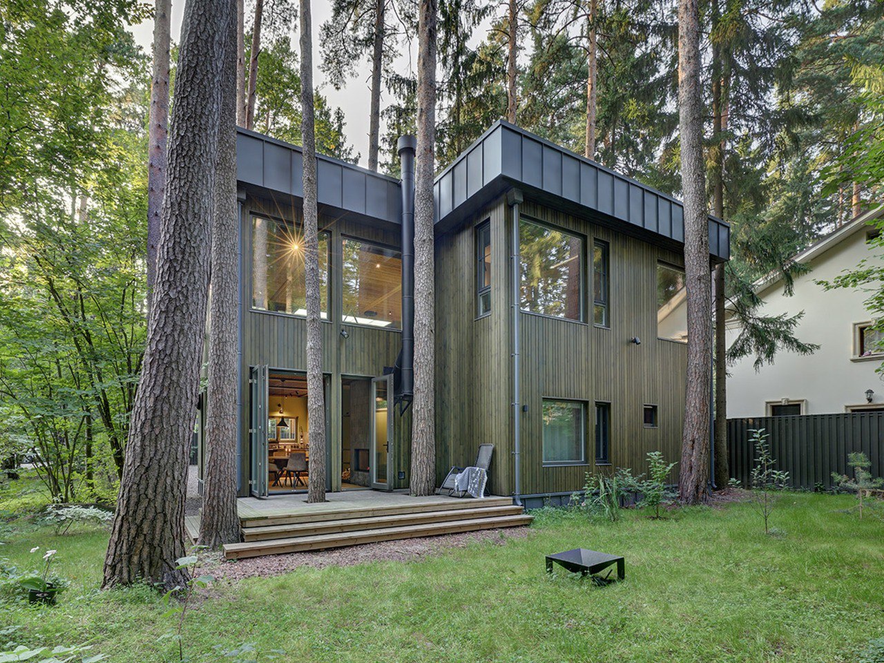 Дом GREEN строился на лесном участке стародачного посёлка. Одно из главных задач проекта – сохранить все деревья. Бережное отношение к природе также нашло отражение в использовании природных цветов и фактур, в лаконичных формах и натуральных материалах.